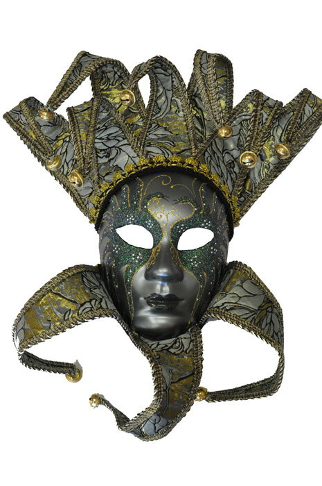 Ice Queen Jester Mask includes full faced mask with glitter decorations painted lips black and gold trim points are made of flexible materials each point with a bell and black ribbon ties for comfortable wear.