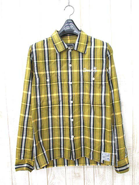 ドレストリップ drestrip シャツ チェック 長袖 ロゴ刺繍 コットン 黄 ネイビー 菜6251S メンズ 【ベクトル 古着】【中古】 150812