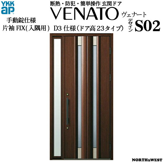 【送料無料】【最安値挑戦】新築、リフォーム、DIYに最適で、「和風」「モダン」などの様々な住宅に合うデザイン性が人気です。YKKAP玄関 断熱玄関ドア ヴェナート[Aタイプ] 片袖FIX[入隅用] D3仕様[ドア高23タイプ]:S02型[幅1135mm×高2330mm]【ykk】【YKK玄関ドア】【断熱ドア】【木目調】【開き戸】【扉】【ベナート】【gennkann】