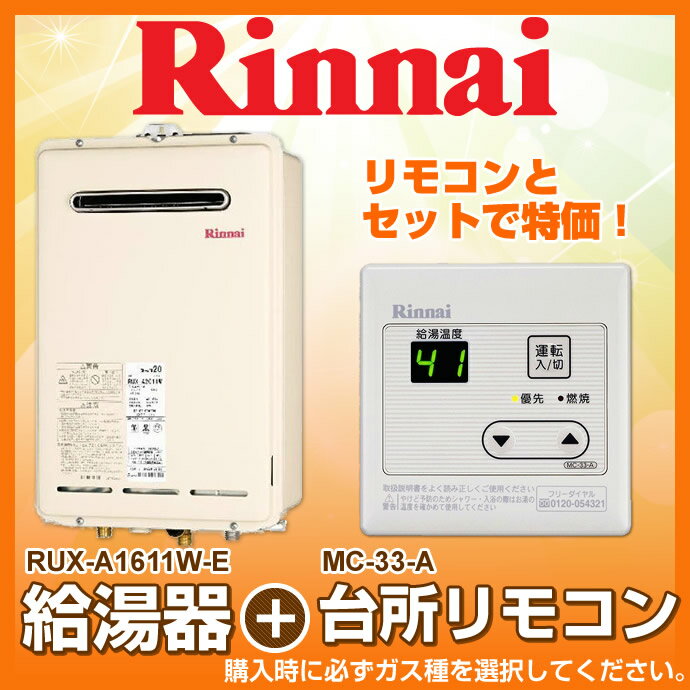 リンナイ 給湯専用 ガス給湯器 壁掛け リンナイ ガス給湯器 【RUX-A1611W-E+MC-33-Aのセット】 給湯専用壁掛16号 リモコンセット 台所リモコン給湯専用【普及タイプ】【落とし込み】【【楽天人気ランキング入賞】[新品]【RCP】