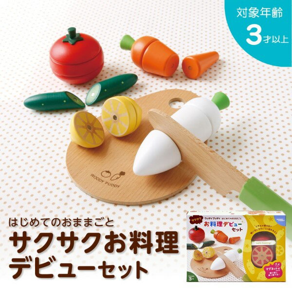 可愛いまな板の上で、サクサク切ろう♪人気のお野菜と果物に包丁とまな板が付いたお料理デビューセットです!切って、くっつけて、また切って・・・。ウッディプッディのおままごとはマグネット式だから何回でも繰り返し遊べちゃう!野菜4点とくだもの1点、料理用ナイフとまな板が入っています。■構成内容:にんじん、だいこん、トマト、きゅうり、レモン、まな板、料理用ナイフ×各1個★WOODY PUDDYのおままごとの特徴★・丈夫で長持ち天然木+マグネットで何回切って遊んでもくっつく!繰り返し長く遊んでいただけます。・かんたんに切れる包丁を使えば、力を入れなくてもサクサク切れる!包丁を使わず手で割ることもでき、小さなお子様でも楽しめます。・切り口がリアル切り方や切り口もリアルにこだわって作りました。切り口のデザインはとっても美味しそうな仕上がりです。・衛生的でやさしい面ファスナーと違い、ごみが付かず衛生的で安心。またプラスチックにはない、やさしい木の肌ざわり。誕生日ギフトや出産祝いなどの贈りものとしても人気です!サイズW25.5×H18.5×D5.8(cm) 規格■素材・成分:ブナ・イジュ・MDF・木目シート・磁石 ※塗料は食品衛生法に基づいた着色料を使用しております。■対象年齢:3歳以上お客様都合による返品:使用済みまたは開封済みの場合、中古品扱いとなりますので、返金額は商品代金より、減額しての返金となります。予めご了承くださいませ。PCモニターにより商品の色は実物とは若干異なる場合がございます。サイズ表記は「約」となっております。(多少のの誤差が生じることがあります。)予めご了承お願い致します。予告なくパッケージのデザインが変わる場合が御座います。予めご了承下さい。商品の搬入が出来なかった、或いは、商品を受け取られなかった場合のご返品は、実際にかかった往復の送料を差し引いてのご返金となります。商品販売時の送料は、通常送料より安価に設定されています。返品時の往復の送料は、各運送会社の一般料金となります。